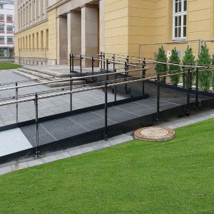 Stabile, wetterbeständige und feuerverzinkte Gummiprofilroste verbinden den Reinigungseffekt einer Eingangsmatte mit der Durchlässigkeit eines Gitterrostes. Besonders interessant ist die freitragende Verlegung von bis zu 1,20 m Stützweite, wohingegen Eingangsmatten komplett aufliegen müssen.